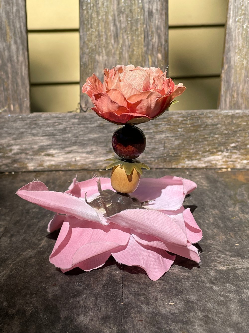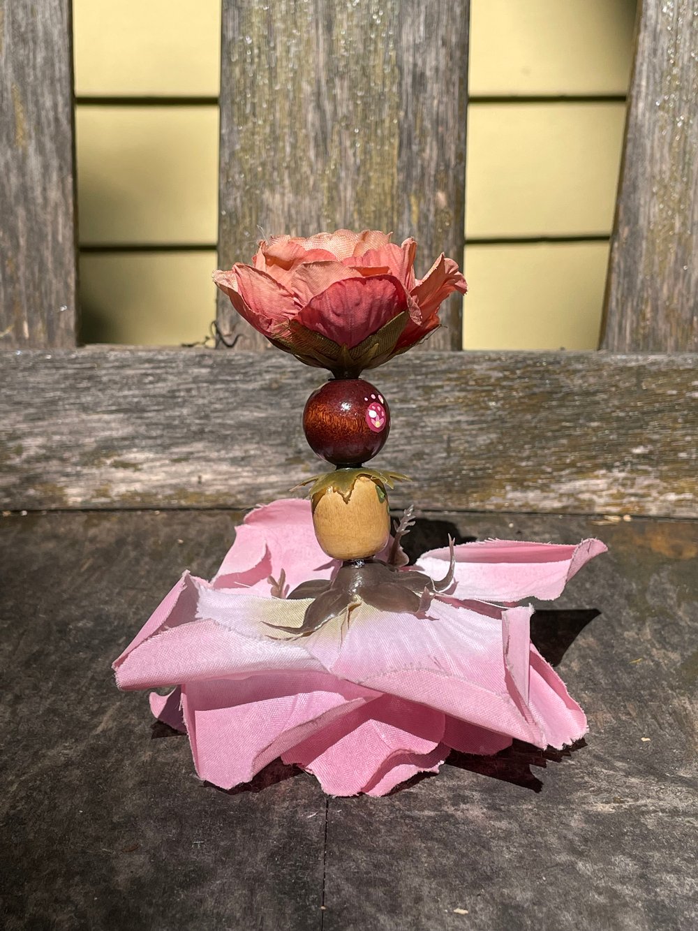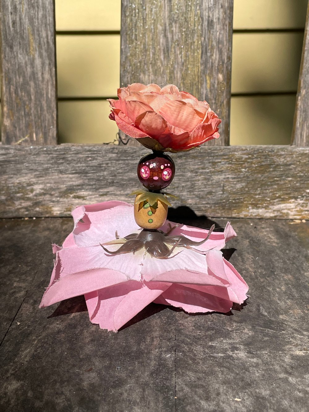 All Faux Flower Fae are crafted with an assortment of fabric flowers, wooden beads, and the little plastic bits that hold the flowers together. The faces are adorned with acrylic paint.