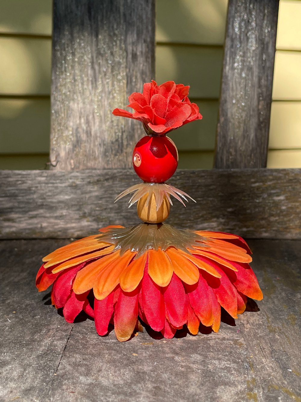All Faux Flower Fae are crafted with an assortment of fabric flowers, wooden beads, and the little plastic bits that hold the flowers together. The faces are adorned with acrylic paint.