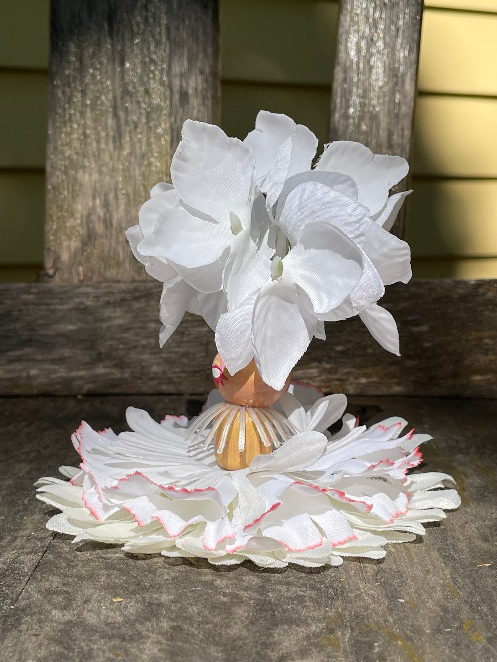 All Faux Flower Fae are crafted with an assortment of fabric flowers, wooden beads, and the little plastic bits that hold the flowers together. The faces are adorned with acrylic paint.